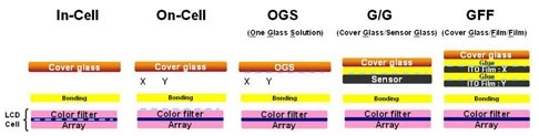 傳統的G/G、GFF屏幕,都是標準的保護玻璃+觸控層+顯示面板層的結構,不同之處在于觸控層。G/G屏幕的觸控層是由1層ITO玻璃基板+1層ITO觸控薄膜組成,GFF屏幕的觸控層則有2層ITO玻璃基板+2層ITO觸控薄膜(ITO:X和ITO:Y)。顯然,G/G屏幕更薄一些。
