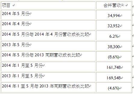 友達(dá)光電公布2014年5月自行結(jié)算合并營(yíng)業(yè)額為新臺(tái)幣349.94億元,較4月份成長(zhǎng)6.2%,較去年同期減少8.6%。