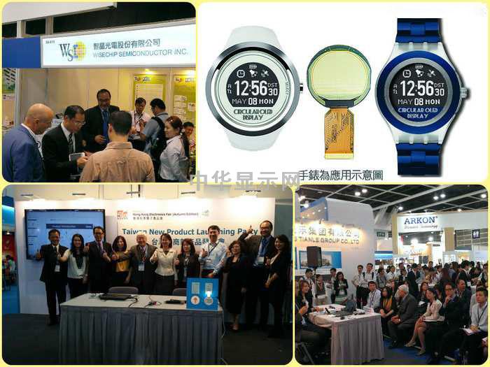智晶光電OLED顯示面板應用在新一代手表(右上),大幅提高產品的價值性;該產品日前由團隊正式對外發表(左下),并多次在海外參展,受到市場高度關注。 智晶光電/提供