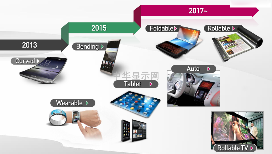 LGD未來將擴大使用P-OLED,2015-2016年推出可撓式平板,2017年發展具有折疊式面板的筆電、可卷式的平板電腦和電視,并把曲型面板用于汽車儀表板。