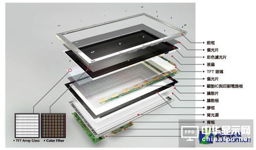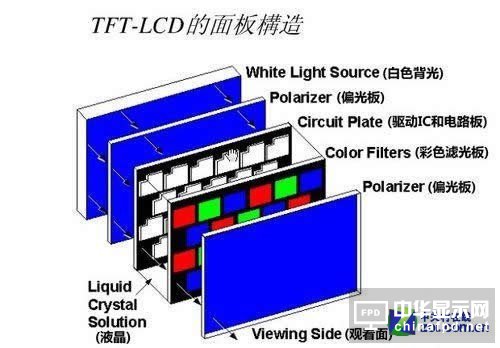 TFT-LCD面板可視為兩片玻璃基板中間夾著一層液晶,上層的玻璃基板是與彩色濾光片結合,而下層的玻璃則有電晶體鑲嵌于上。 當電流通過電晶體產生電場變化,造成液晶分子偏轉,借以改變光線的偏極性,再利用偏光片決定畫素(Pixel)的明暗狀態。