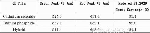 表1:量子點薄膜的種類和BT.2020的覆蓋率