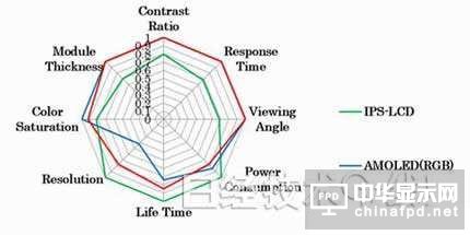 TFT液晶方面,IPS方式已成為移動產品用顯示屏的事實標準,而且也得到大屏幕電視機廣泛采用。比較的光學特性包括對比度、響應時間、視角、耗電量、壽命、分辨率、色彩表現范圍及模塊厚度。有機EL的優點是薄、高對比度、高速響應及大視角。不過,壽命和耗電量在實用化方面存在巨大課題。通過應用彩色濾光片,雖然解決了掩模蒸鍍的色彩分涂課題,但耗電量增加。