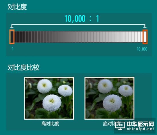 亮度及對(duì)比度對(duì)于顯示屏幕的畫質(zhì)來說是至關(guān)重要的部分。隨著畫面亮度的提升,顯示屏幕會(huì)呈現(xiàn)出更加清晰的影像;而對(duì)比度的變化,可使亮處更亮、暗處更暗、從而達(dá)到明暗分明的理想效果,顯示屏幕可呈現(xiàn)出更加豐富的色彩。對(duì)比度高低可以通過最亮處(白色)和最暗處(黑色)之間的部分能夠分成多少個(gè)“階梯” 來界定。如果中間的部分分成一萬個(gè)階梯,那么對(duì)比度可表示為10000:1。