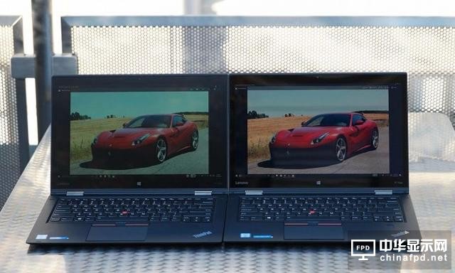 由于OLED屏幕每個像素的亮度可以單獨控制,因此能夠帶來更大的反差效果,這也會讓內容變得更加清楚。當我們將OLED和非OLED屏幕的X1 Yoga筆記本放到室外陽光下直接對比的時候,OLED由于具有可調光性,文字顯示效果(右)甚至比LCD還要清楚。
