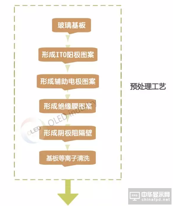 形成ITO電極圖案,為了在圖案化ITO的表面露出發(fā)光的部分,需要制備絕緣層,一般采用光刻膠的高分子材料作為絕緣薄膜,最后,由于基板上可能會(huì)有殘留的光刻膠或者空氣中的灰塵、水汽因此需要對(duì)基板進(jìn)行清洗處理。