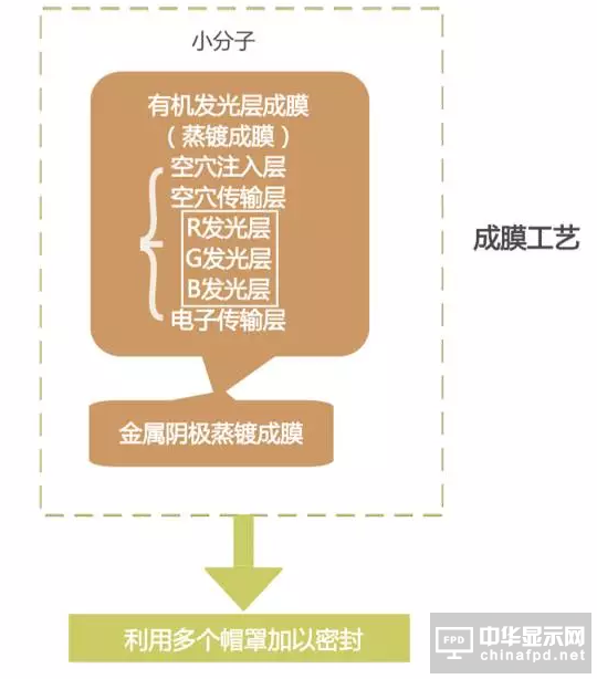 在薄膜制備階段,采用小分子或者高分子的有機(jī)材料的過程是不一樣的,小分子材料器件采用多層構(gòu)造,通過真空蒸鍍的方法形成注入層/發(fā)光層等薄膜。而高分子材料采用的則是單層構(gòu)造。