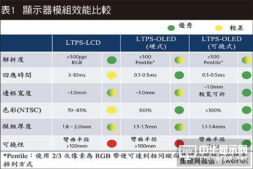 現今OLED顯示器在色彩、反應時間、延遲等優異的表現,加上能提出不凡的工業設計(表1),皆是吸引手持式裝置品牌廠的價值主張。