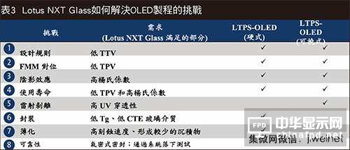 在硬式OLED制程方面,有著五項玻璃相關挑戰,在可撓式OLED制程方面則有著四項,從表3的八項領域可一窺這些難處,還有Lotus NXT Glass能協助面板制造商克服難題的屬性。