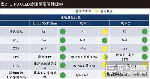 在表2內比較Lotus NXT Glass與兩款次佳浮式玻璃,列出前述所謂有利于OLED制程的玻璃屬性。 康寧投入無比的時間與面板制造商合作了解其需求,且在用于LCD和硬式OLED面板的新興LTPS及氧化物薄膜晶體管(Oxide TFT)背板領域中推動創新。 我們了解硬式及可撓式OLED顯示器的制程還有面板制造商在制程中所面對的難處,以及將玻璃用于解決這些難處時所扮演的重要角色。
