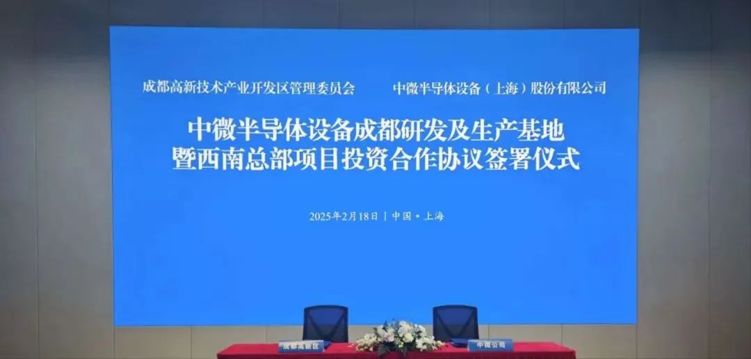 2月18日,中微半導體設備(上海)股份有限公司(下稱“中微公司”)與成都高新區簽訂投資合作協議,企業將在成都高新區設立全資子公司并建設研發及生產基地暨西南總部項目,總投資額約30.5億元,注冊資本1億元,并計劃購地50余畝,用于建設研發中心、生產制造基地、辦公用房及附屬配套設施,以滿足量產需求。項目擬于2025年啟動建設,2027年正式投入生產。