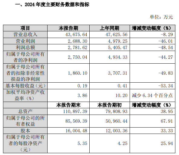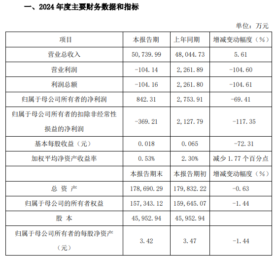 2024年度,公司實現營業總收入50,739.99萬元,同比增長5.61%;實現歸屬于母公司所有者的凈利潤842.31萬元,同比減少69.41%;實現歸屬于母公司所有者的扣除非經常性損益的凈利潤-369.21萬元,同比減少117.35%。