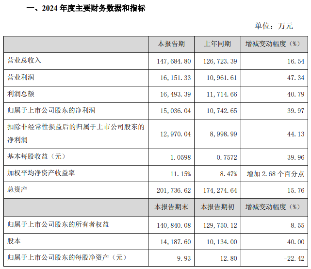 報告期內,公司實現營業總收入147,684.80萬元,同比增長16.54%;歸屬于上市公司股東的凈利潤15,036.04萬元,同比增長39.97%;扣除非經常性損益后的歸屬于上市公司股東的凈利潤為12,970.04萬元,同比增長44.13%;加權平均凈資產收益率11.15%,同比增長2.68個百分點。
