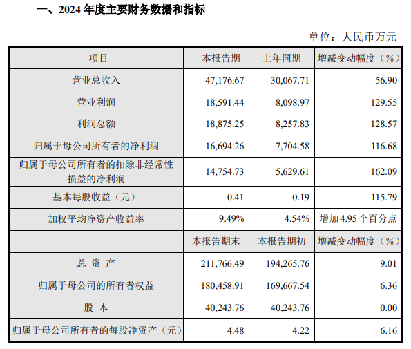 報告期內,公司實現營業總收入47,176.67萬元,同比增長56.90%;實現歸屬于母公司所有者的凈利潤16,694.26萬元,同比增長116.68%;實現歸屬于母公司所有者的扣除非經常性損益的凈利潤14,754.73萬元,同比增長162.09%。