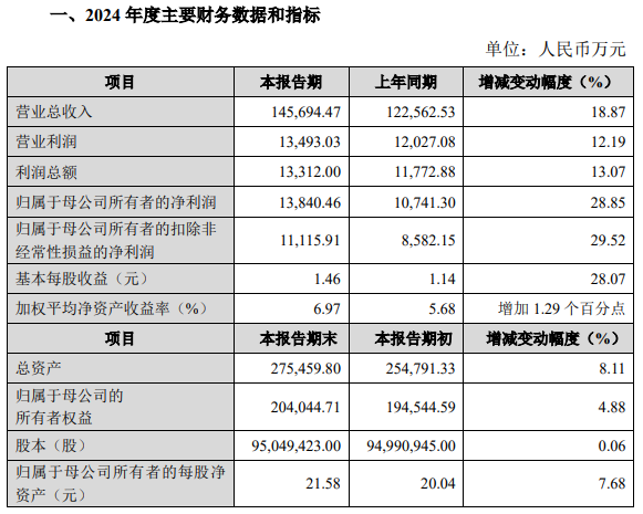 報告期內,公司實現營業收入145,694.47萬元,同比增長18.87%;實現利潤總額13,312.00萬元,同比增長13.07%;實現歸屬于母公司所有者的凈利潤13,840.46萬元,同比增長28.85%。