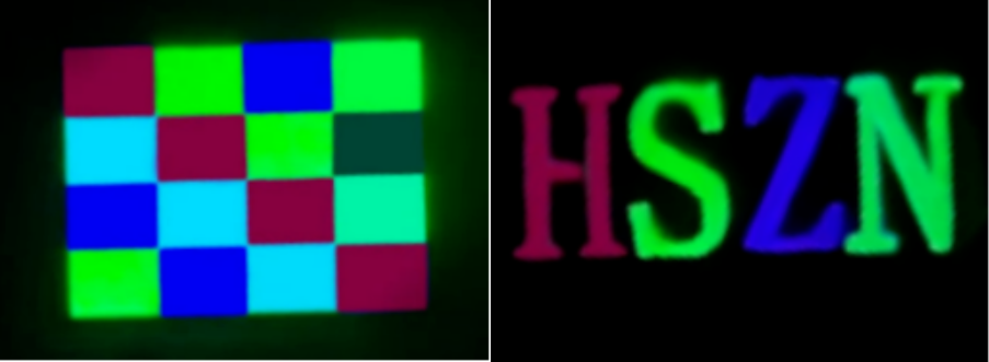 圖1:鴻石智能單片全彩MicroLED微顯示芯片實拍-紅綠白藍黑測試圖