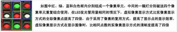 顯示單元中每一點的紅、綠、藍顯示組成部分均勻分布,以配合像素的混色效果;虛顯示點的表征顏色由相鄰的紅、綠、藍像素混色構成。 虛擬像素的點是分散的,實像素的點是凝聚的。虛擬像素的發光點在燈管間,實像素的發光點在燈管上。